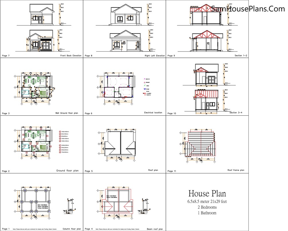 22x28 Small House Plan 2 Beds 6.5x8.5 Meter Gable Roof Pdf Full Plan. This house is perfect for medium family with 2 bedrooms, and 1 bathroom.