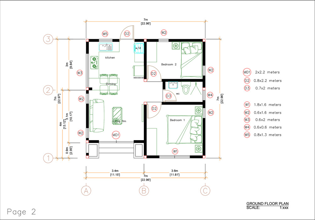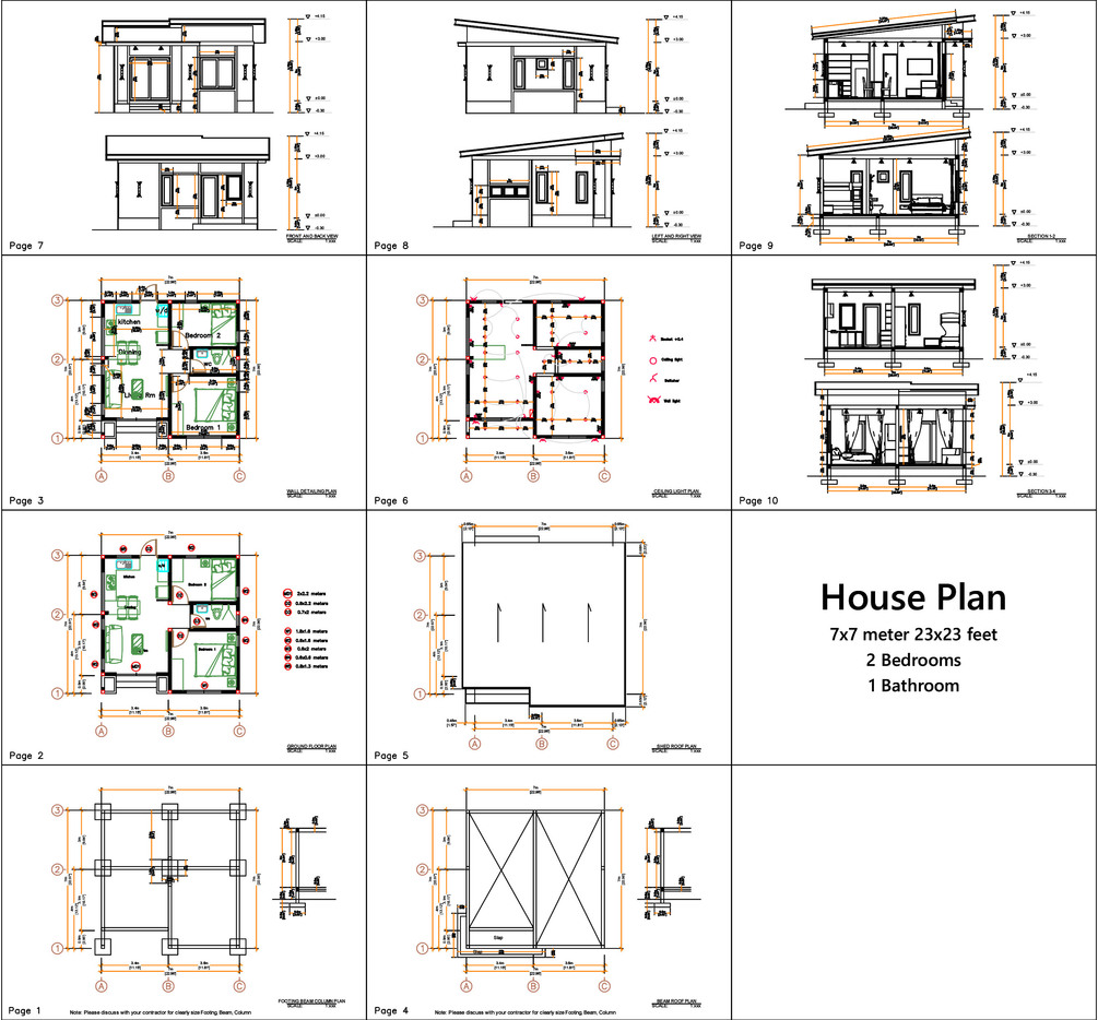 23x23 Feet Tiny House 7x7 Meters 2 Bedrooms PDF Plans