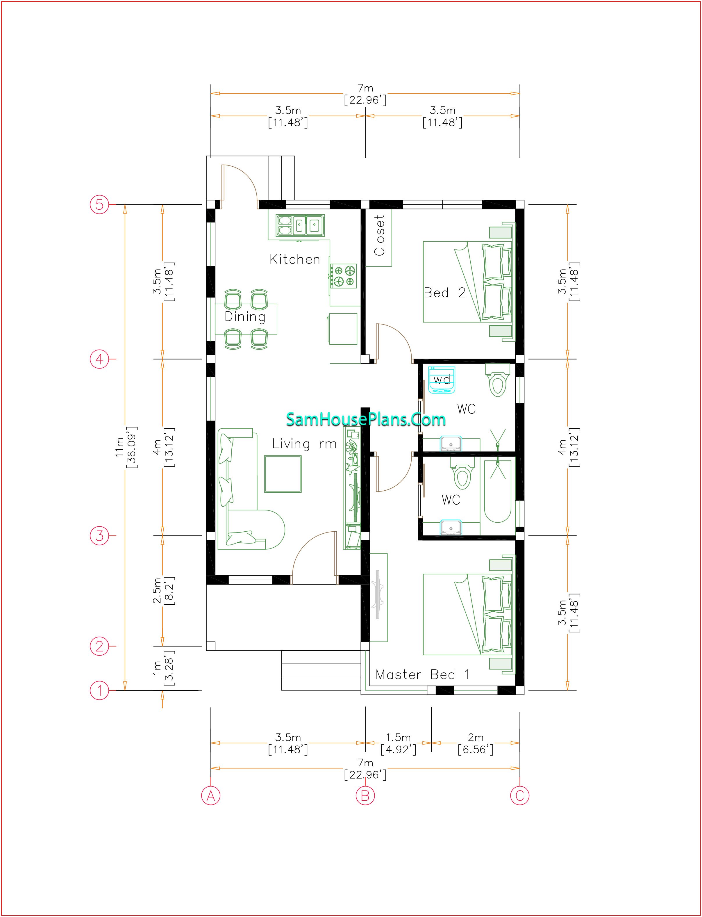 23x36 Small House Design 7x11 Meters 2 Bedrooms PDF Full Plans