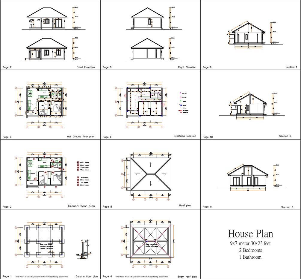30x23 Small House Plan 2 Beds 9x7 Meter Hip roof Pdf Full Plan. This house is perfect for medium family with 2 bedrooms, and 1 bathroom.