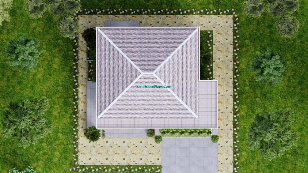Finally, The hip roof type is made from Cement tiles that cover above Gypsum board ceiling . It is make the house look simple and modern.