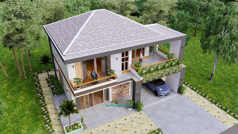 Finally, The hip roof type is made from Cement tiles that cover above Gypsum board ceiling . It is make the house look simple and modern.
